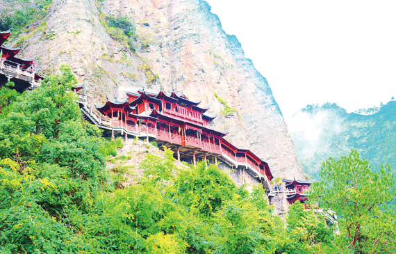 远远望去,有“天上寺院”之称的悬空寺像玲珑剔透的浮雕镶嵌在万仞峭壁间。近看悬空寺,大有凌空欲飞之势。整个寺院上载危崖,下临深谷,在一百多平方米的面积上,建筑有40间大小阁殿,之间用曲折回环的栈道连通。